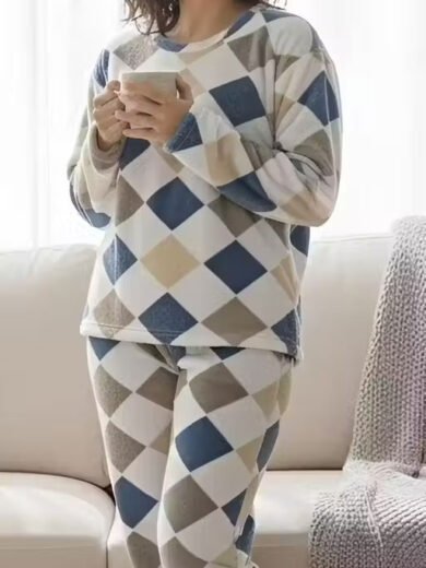 StyleNindia Women's Fuzzy Print Fleece Nightsuit Set | Cozy Winter Printed Night Suit for Ladies (Blue & Beige Argyle)